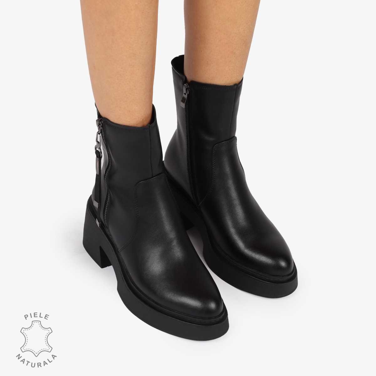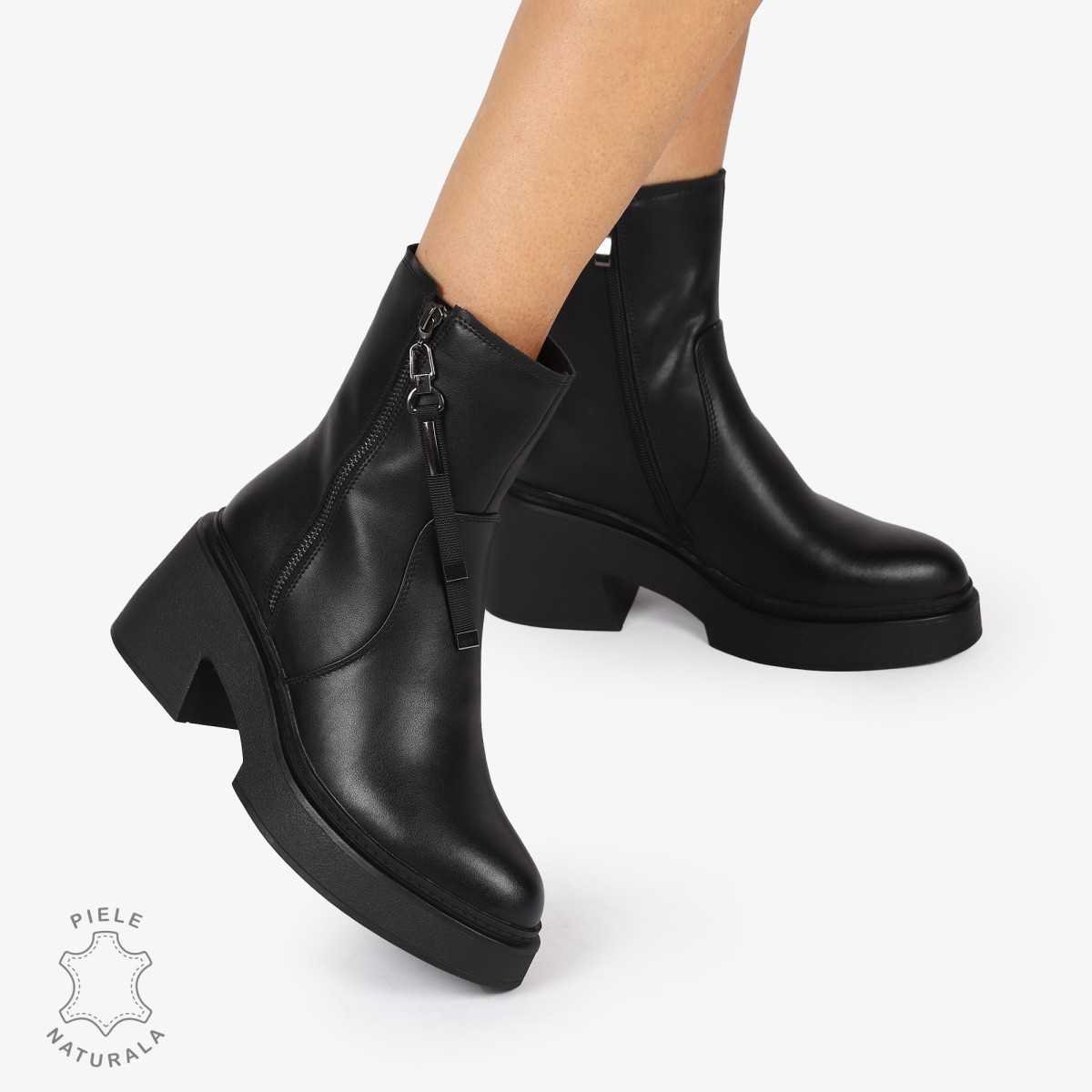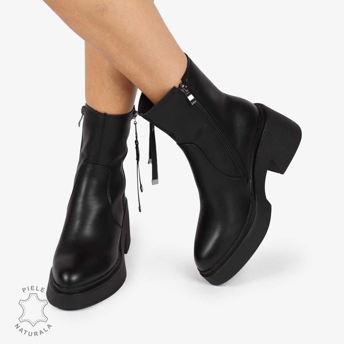 BOTINE DIN PIELE NATURALA cu Fermoar lateral si toc Gros CRL1243 Negru